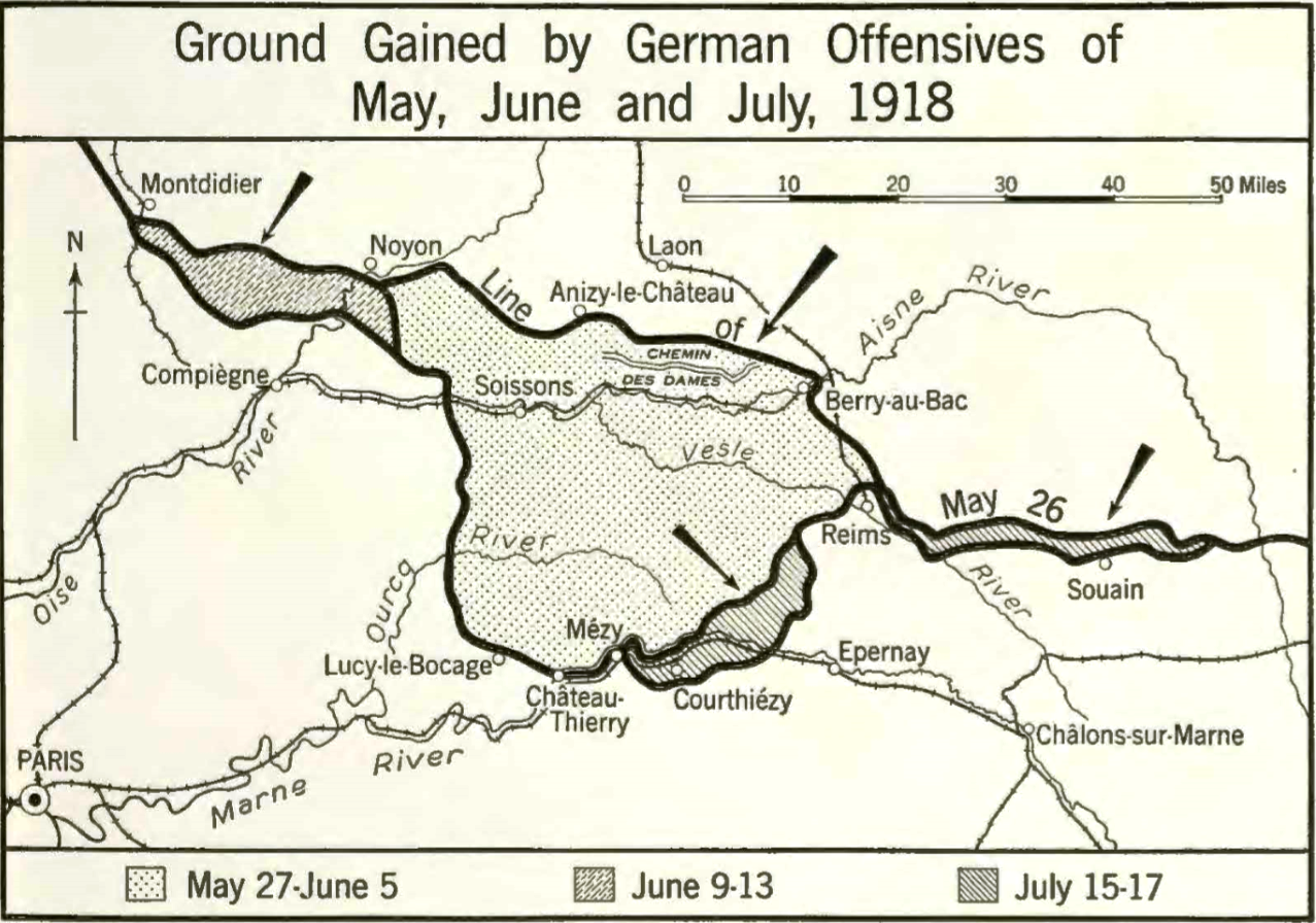 Au cours de l’attaque allemande dans l’Aisne, plusieurs divisions US sont engagées. L’avance allemande est stoppée au bois Belleau par la 2e division et ses Marines et à Château-Thierry grâce à la résistance de la 3e division. En remerciement de ces exploits, le bois Belleau prendra le nom de bois de la brigade de marine et la 3e division sera qualifiée de Division Marne.